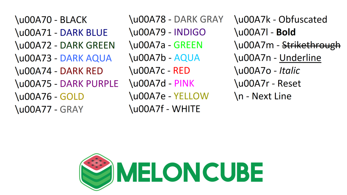 Make sure your server is updated to 1.4 2. 18 rows · use the name code for minecraft commands and json. These editing properties allow for better emphasis of important information, easier reading, or simply add flavor to the game. Below, we have provided the entire list of format and color codes and explained how to set them. If you have your own minecraft server and want to set the motd, you must use the following code. Scroll down until you see motd 4. Minecraft allows you to format the text displayed in particular objects and world properties to have different colors or formatting. Color name/description §4 \u00a74 dark_red §c \u00a7c red §6 \u00a76 gold §e \u00a7e yellow §2 \u00a72 dark_green §a \u00a7a green §b Also, you can share these minecraft codes with your friends. Please select the color code from the table and use it in server.properties. The chat codes and motd … §0 = black §1 = dark blue §2 = dark green §3 = dark aqua §4 = dark red §5 = purple §6 =. How to edit server.properties and pack.mcmeta.
